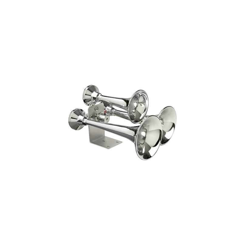 If you`re a truck owner demanding an ultra-powerful horn, then the Cannon Ball Express air horns from Wolo are the ones to choose. A true train horn sound is produced by three brass triple chrome plated trumpets. The Cannon Ball Express truck air horns come with a steel plated base, required mounting hardware, and a 10 ft. length of 1/4 in. nylon high-pressure hose.